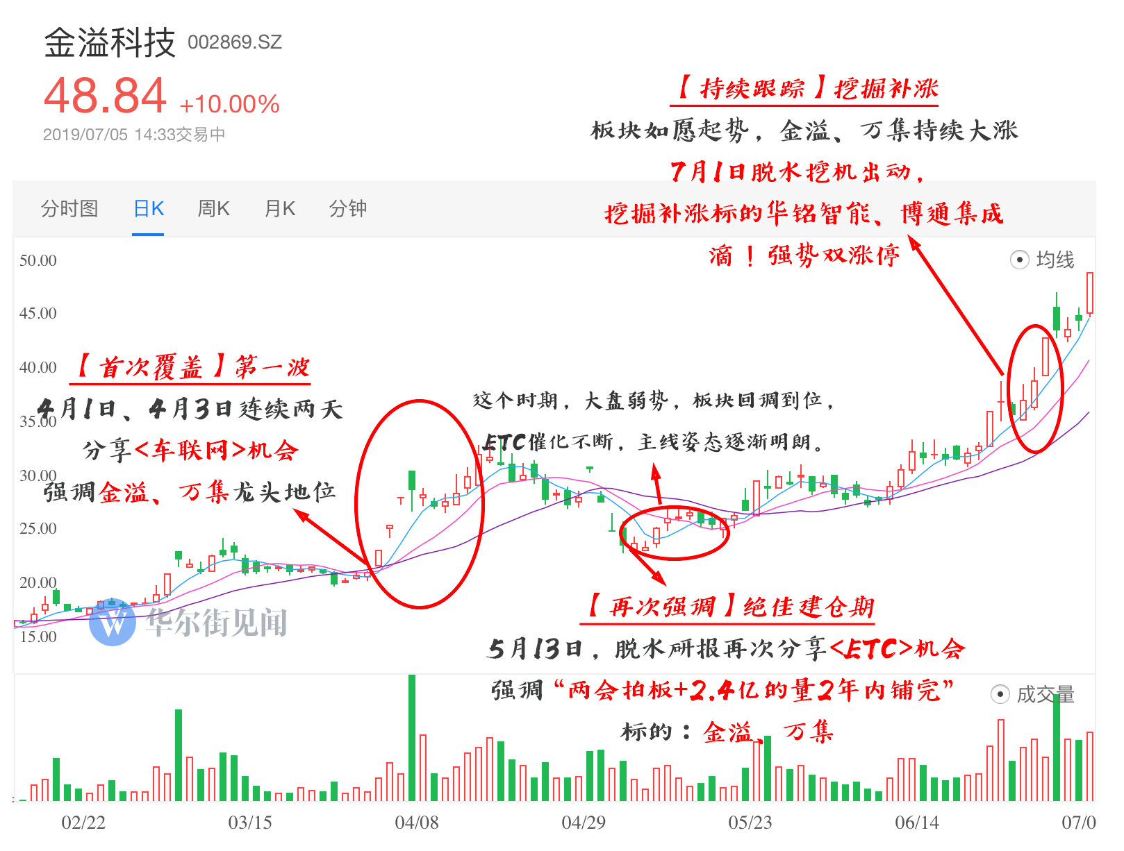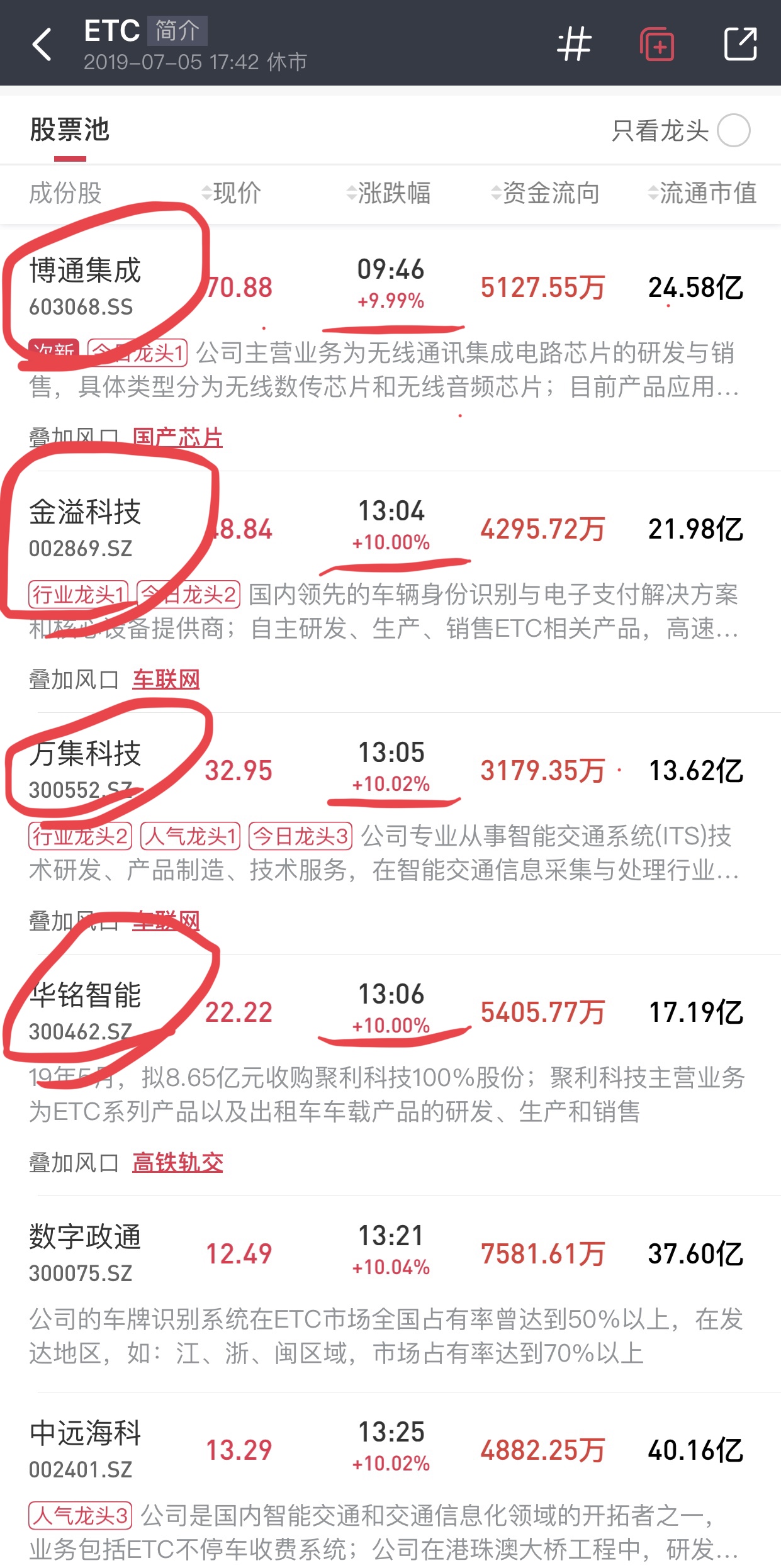 所以,抓住主线(金溢、万集),并且不断深入挖掘(博通集成、华铭智能),就是脱水君擒拿ETC板块4个涨停的秘诀。