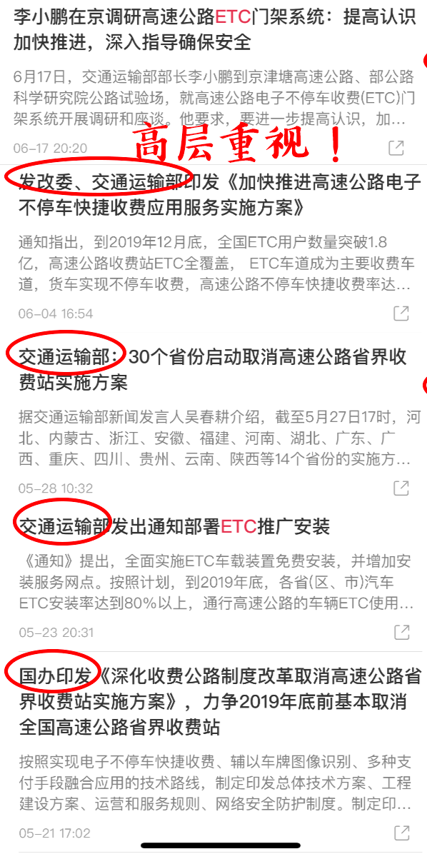 ①高层重视:两会拍板,交通运输部多次确认,两年内实现不停车快捷收费,ETC确定受益;