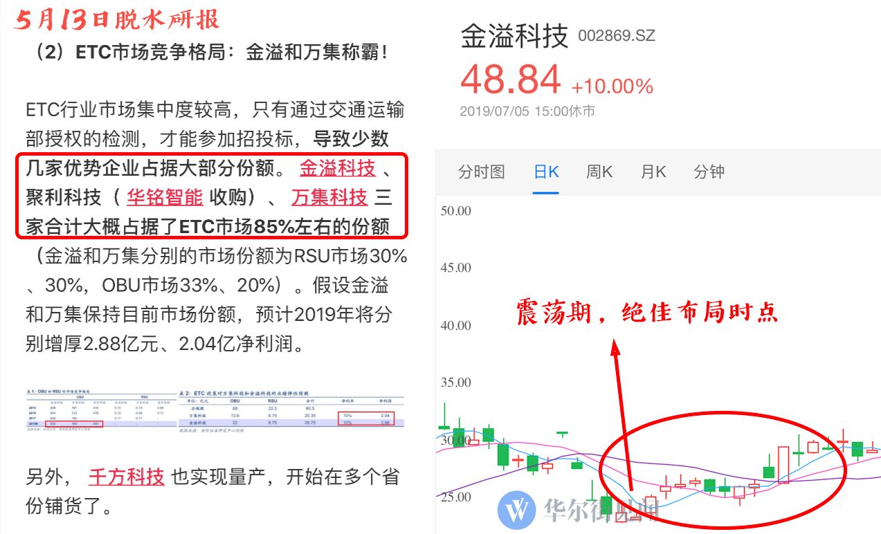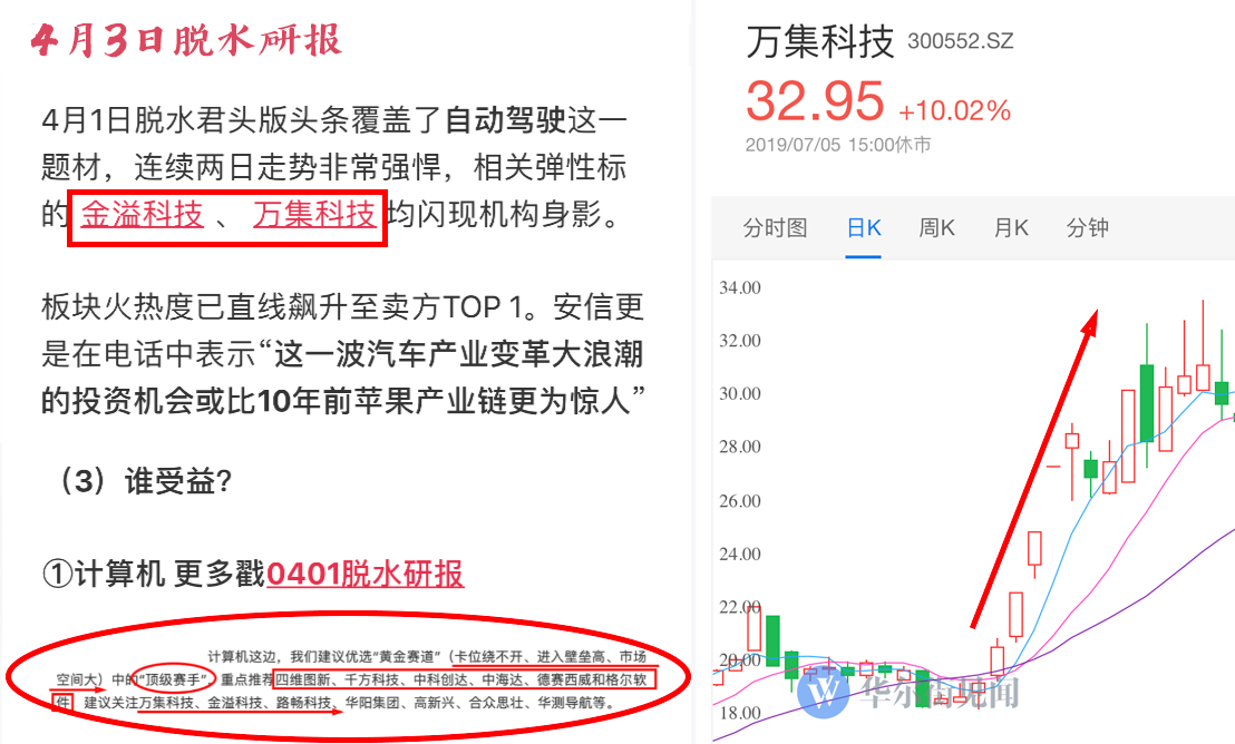 4月1日、4月3日,脱水研报连续两天分享了<车联网>的机会,强调了金溢、万集龙头地位。此后,金溢科技、万集科技迎来3个涨停,并大涨数日。(原文链接:0401脱水研报 、 0403脱水研报)