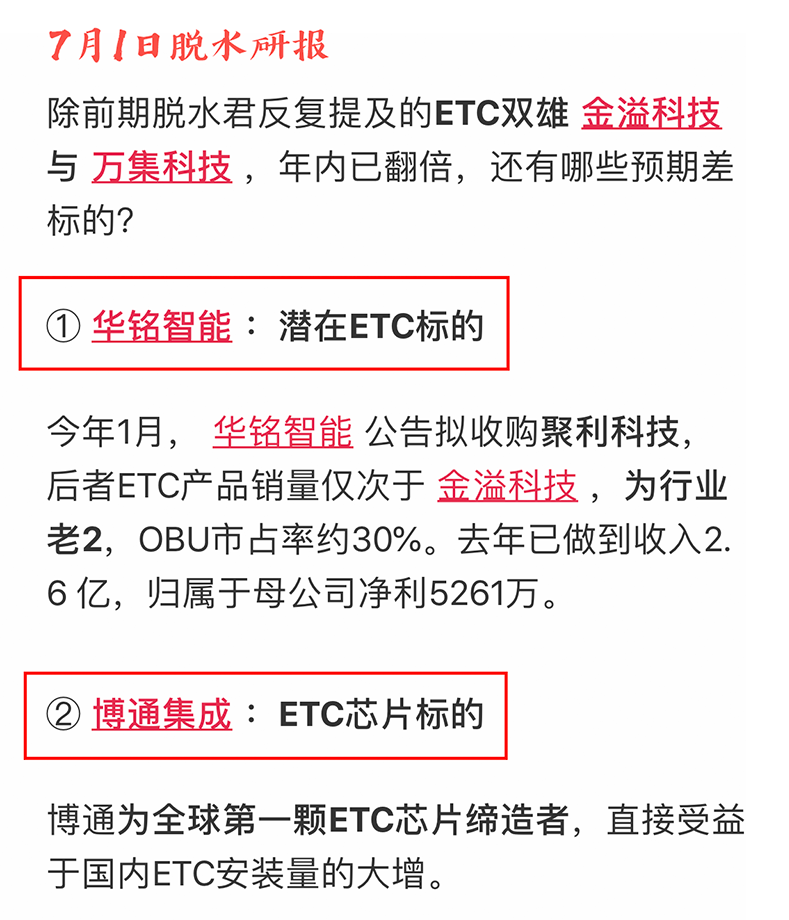 观察到板块东风已来,龙头金溢、万集持续大涨已在高位,7月1日脱水挖机出动,挖掘补涨标的华铭智能、博通集成,如今也如愿涨停。(原文链接:0701脱水研报)