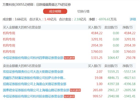 不过,机构乘机大举低吸。交易所公布的龙虎榜数据显示,万集科技今日买入的前4个席位均为机构席位,合计买入1.22亿元,占今日总成交金额的11.6%;卖方前五席位均为券商营业部,合计卖出2.07亿元。