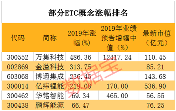 2019年,万集科技以486%的涨幅位居A股年度涨幅榜首位,是去年不折不扣最强牛股。受益于政府持续积极推进ETC的采购和建设,整个ETC概念都录得不小涨幅,证券时报·数据宝统计显示,ETC概念指数去年涨幅高达192%,位居所有概念涨幅榜前列。其他ETC概念股去年涨幅也是巨大,金溢科技涨幅达到313%,博通集成、亿纬锂能涨幅均超200%,华铭智能、鹏辉能源涨幅超60%。