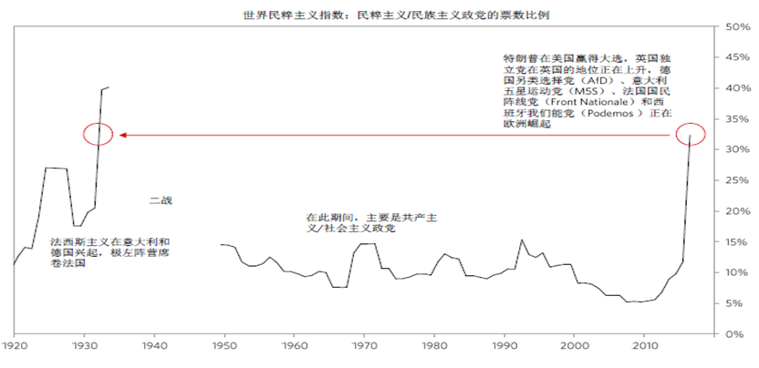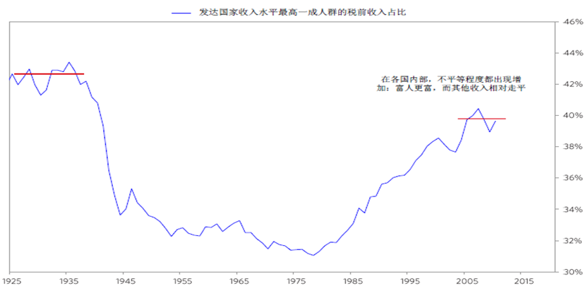 如果把民粹主义作为指数,今天的情况与1930年几乎不相上下,民粹主义上升不利于全球政治经济合作,加大经济波动。而民粹主义变化的重要原因是由于收入分配变化,例如,美国从60年代开始,底层50%人的收入从21%跌到12%,而顶层1%的收入从10%上升到20%。另外,如果就业持续恶化,民粹主义也会强化。