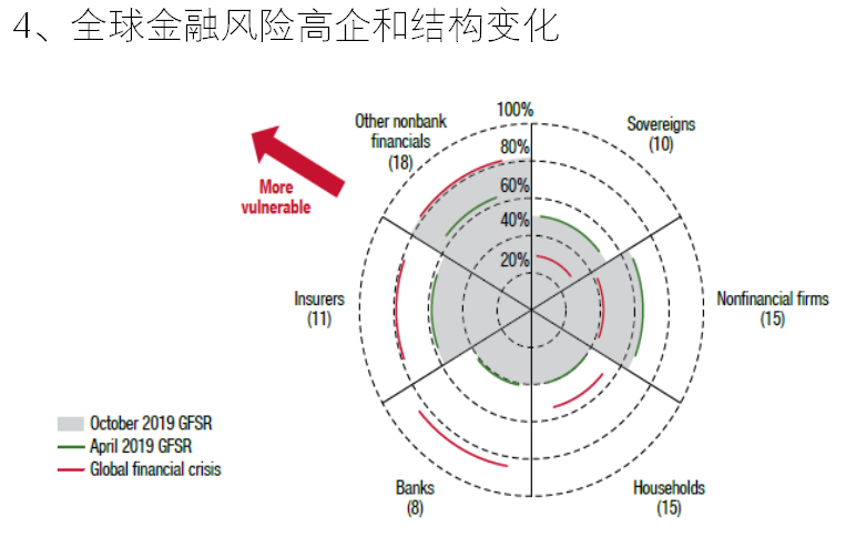 而市场调整是否会引发危机需要看金融面:一是、高债务成为巨大的潜在风险,2008年,G20整体债务80万亿美元,今天达到146万亿美元;二是、企业债务和主权债务的上升成为风险点,这不同于2008年的红线风险,与2008年相比,今天银行业风险、保险业风险和居民信贷风险均有所下降。