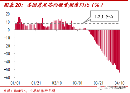 同时,3月以来美国抵押贷款再融资申请激增,数值接近去年同期的3倍,而购房市场却冷清,抵押贷款购买指数创2015年来的新低;截止4月10日,美国房屋销售合同签约量周度同比下跌54%,较1-2月平均增速下滑了60多个百分点。