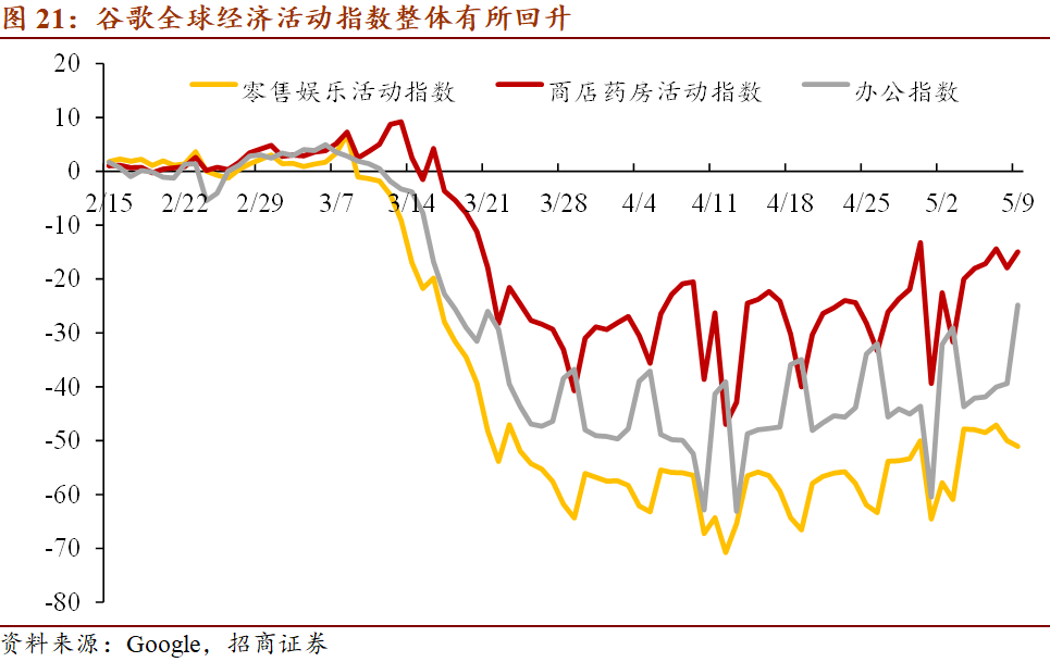 谷歌发布的活动指数(Mobility Report)显示,全球复工活动正在展开,商店药房活动指数的回升表明日常基本消费需求也开始恢复,办公指数也出现更为显著的回升,零售娱乐活动指数回升幅度相对较小,显示疫情对于非必需的消费活动仍有抑制作用。