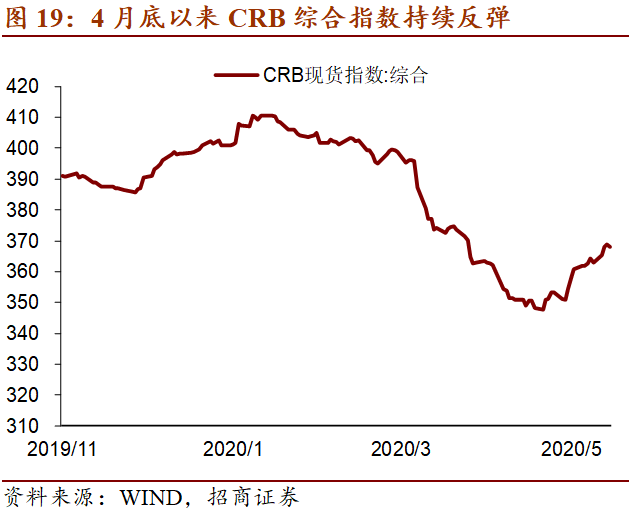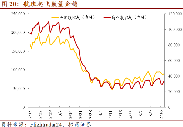 CRB商品价格指数与现货指数近期都逐步回暖,表明大宗商品的价格有望改善;航班起飞数量在近六周虽然仍处于低位但基本保持稳定上升的态势并逐渐呈现正常时期的波动状况,表明远途运输与人员交流的秩序日益恢复。