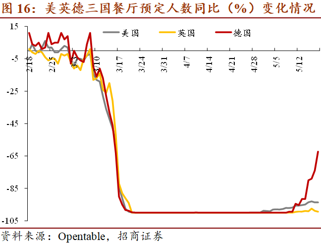 餐饮业恢复情况各异,目前德国>美国>英国。三月中旬各国相继实施管控措施后,实体餐饮全面歇业。5月9日起德国餐厅预定人数开始回升,近10天连续攀升,餐厅预定人数同比增速已从-99.42%上升至-62.32%,改善趋势明显。美国5月以来餐厅预定人数缓慢增长,5月1日餐厅预定人数同比为-98.8%,到5月18日降幅已收窄至-93.7%。英国目前餐饮业压力相对较大, 5月18日餐厅预定人数同比仍为-99.4%。