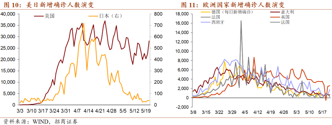 (1)疫情发展:欧日、美国先后于4月、5月出现新增确诊人数的回落。