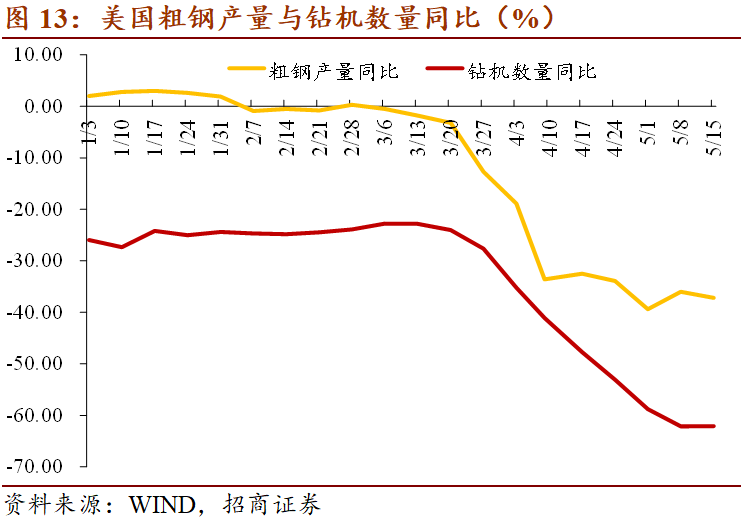 美国粗钢产量增速小幅边际改善,1-4月美国粗钢产量的4周同比均值分别为2.6%、-0.5%、-4.6%以及-29.7%。4月26日至5月16日,粗钢产量周同比增速分别为-39.4%、-36.0%和-37.2%,5月以来小幅边际修复。