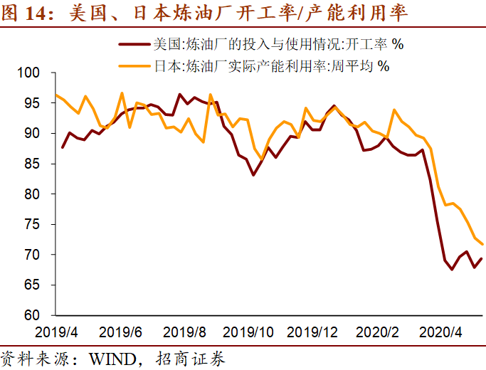 美国钻机数同比增速、炼油厂开工率仍处于底部。1-3月美国钻机数量同比均值为-24.9%,受油价下跌影响,已经出现较为明显下滑,3月28日至5月15日的7周内,钻机数量每周的同比增速分别为-35.2%、-41.1%、-47.7%、 -53.1%、-58.8%、-62.2%、-62.1%,可见进入5月以来钻机数量的下降态势有所缓和,目前仍处于筑底阶段,但尚未回升。炼油厂方面,1月美国炼油厂开工率均值为90.1%,此后一路下滑至5月8日的低点67.9%,4月10日至5月15日均处于67-70%左右水平。
