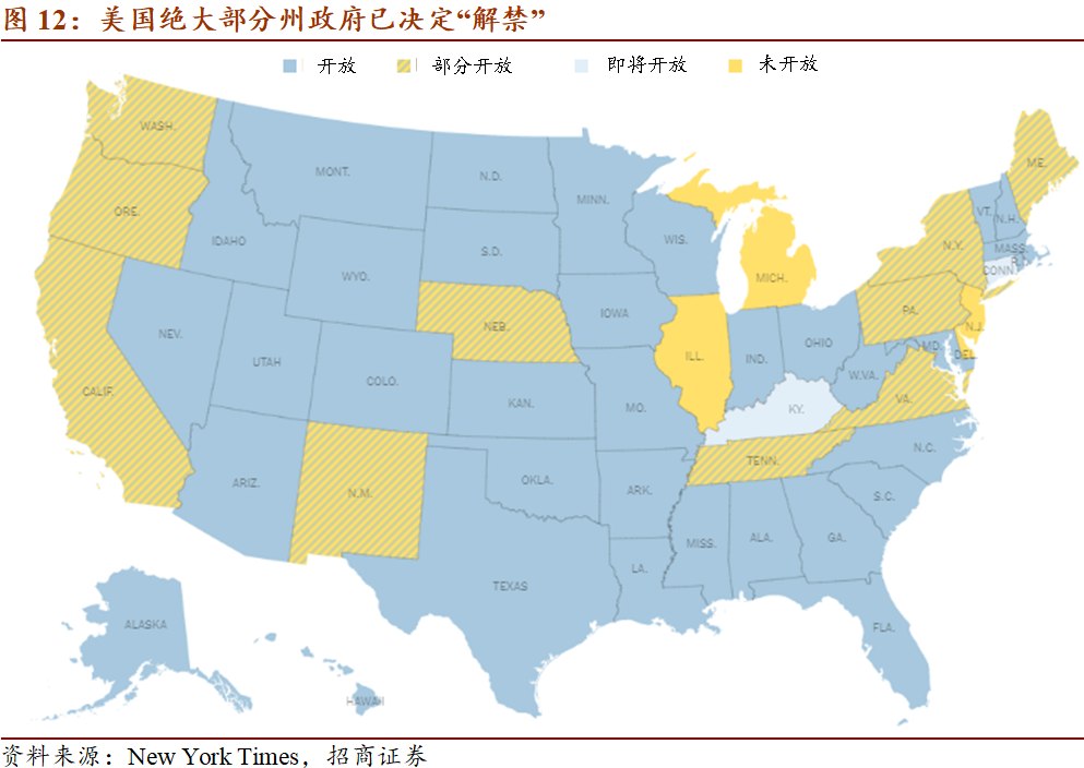 4月16日,美国白宫发布《重启美国指南》,指导各州分3阶段逐步解封、重启经济,同时允许各州根据自身情况制定重新开放计划。4月17日,共和党传统票仓德克萨斯州宣布将逐步开始解除因新冠疫情而实施的限制措施,成为美国解禁的第一个州。美国总统特朗普出于经济和大选的考虑,极力支持复工,截至5月19日,全美50个州仅有4个未宣布“解禁”时间和措施,绝大部分州政府已解除居家令的限制要求。