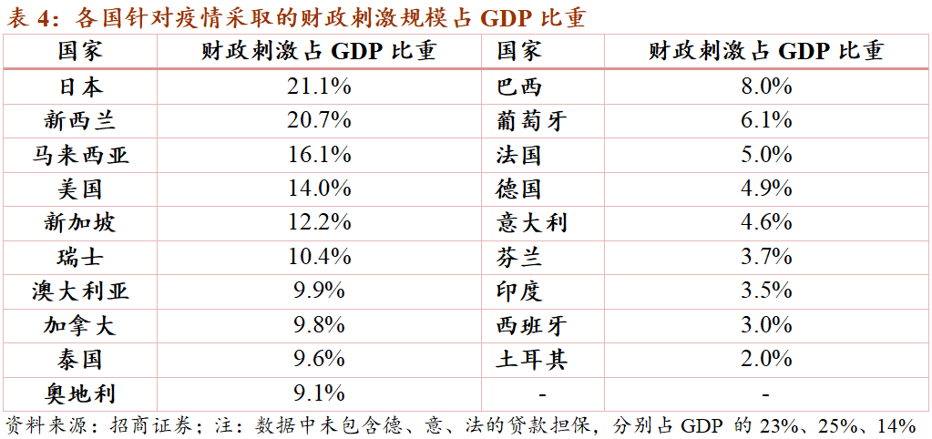从政策来看,主要发达国家的财政扩张态度坚决,新兴经济体刺激规模相对较小。各国财政政策的重点投向主要包括:(1)为企业提供流动性支持;(2)减税、延缓税收;(3)减缓失业;(4)救助低收入人群。政策的方向均为阻断经济主体受到疫情重创后引发的负向循环,方向明确。从政策规模来看,发达国家相对较大,而新兴经济体相对较小。同时,考虑到新兴市场可能因疫情和美元强势而面临更大的资本外流压力,因此流动性层面上新兴经济体也相对差于发达国家。