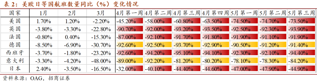 航班降幅欧洲>美国>日本,目前仅意大利出现改善。1月欧美日国家航班数量同比增速普遍集中于-4%至3%的水平,此后出现剧烈下滑,日本降至-45%左右,近期小幅改善;美国最低降至-74%,当前处于低位徘徊中;欧洲国家航班数量同比增速的低点普遍下降至-90%以下,目前疫情最早发酵的意大利出现了一定的改善,同比增速一度回升至-78%,而其他欧洲国家大体处于-90%以下的低位。