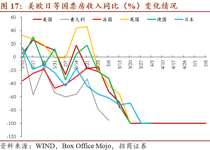 影院仍处于普遍停业状态。3月底以来各国电影行业几乎进入停滞期。四月底开始美国德克萨斯等州开放了部分影院,另据洛杉矶时报消息美国汽车影院将陆续开放,但这些措施对于行业原有规模而言仍是杯水车薪。欧洲与日本的情况则更为严峻,多个国家已超过七周没有更新票房收入数据。韩国近期娱乐场所引发的聚集性传染事件也给各国娱乐行业的复工敲响了警钟,欧美日等国电影行业或将继续承压。