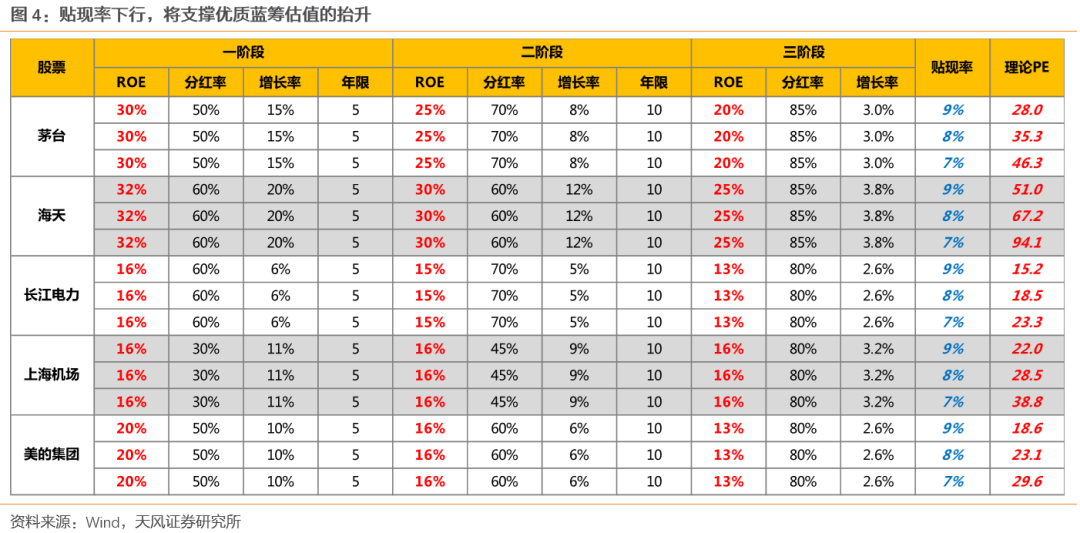 更低的预期回报目标,意味着更低的贴现率水平,而贴现率本身对合理估值的判断影响很大。我们用三阶段增长模型模拟蓝筹股未来的理论估值水平,以茅台为例,在其他假设条件一样的情况下,若将贴现率从当前9%的假设降至8%,则理论估值由28倍提升至35倍,若贴现率进一步降至7%,则理论估值提升至46倍。