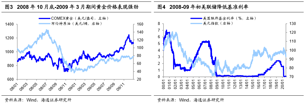 第二,货币属性。黄金作为名贵金属,自古以来天然具有货币属性,虽然目前黄金已退出流通流域,但是在各国国际储备中黄金依然是重要的储备资产。当前黄金以美元计价,当美元流动性宽松或者美元贬值时,黄金价格趋向上涨,反之亦然。典型代表时期是2008年10月至2009年3月,当时COMEX黄金价格率先企稳,最大涨幅为42%,其他大宗商品持续下跌至08年12月,此后才开始反弹,布伦特原油最大涨幅为46%,LME铜为45%,LME铝为41%。当时黄金价格上涨的背景是2007年初美国已经陆续出现金融机构住房按揭业务的巨额亏损和金融机构倒闭,2008年7月“两房”濒临倒闭和9月雷曼破产将次贷危机爆发推向高潮,流动性紧张引发了全球风险资产的系统性风险。危机初期美国经济对冲政策囿于道德风险推进缓慢,这使得美国次贷危机演变升级为全球金融危机。为缓解市场流动性压力,美联储救市方案将基准利率降至0-0.25%区间并使用总计8000亿美元直接购买国债和向金融市场的特定领域注入流动性。当时美元也迅速贬值,美元指数从08年10月阶段性高点87点迅速降至08年12月低点78点,累计跌幅达到9.9%。在全球宽松流动性和美元贬值背景下,以美元为计价单位的黄金价格开始上涨。
