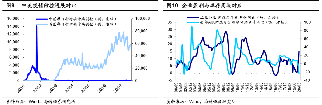 往后看,A股相比黄金会更有吸引力。前文我们提到这次A股黄金齐涨类似08年底-09年初,在09年3月之后黄金价格继续上涨,截止2011年8月COMEX黄金最大涨幅为118%,其他大宗商品价格也大幅上涨,布伦特原油价格为161%,LME铜为149%,LME铝为100%。08年10月至09年3月黄金价格上涨主要体现其货币属性,09年3月之后黄金继续上涨主要体现其商品属性,当时全球货币政策保持宽松,经济开始复苏,这刺激了对大宗商品需求,从而驱动大宗商品价格上涨,黄金也概莫能外。总之,2008-11年期间黄金走势强劲得益于两大投资逻辑支撑价格上涨,这次黄金能否通过体现商品属性继续上涨有待继续跟踪。当前全球新冠肺炎持续蔓延,新冠肺炎疫苗研发前景还不明确,各国防控能力参差不齐,新冠肺炎疫情还未完全控制住,中国疫情防控效果显然好于全球主要国家,截止2020年8月8日,我国每日新增新冠肺炎患者为92例,累计确诊8.9万例,而美国分别为5.4万例、515万例,印度为6.5万例、215万例。由此,我们预计全球经济能否实现复苏还存在不确定性,全球对大宗商品的需求存在不确定性,当前黄金价格上涨仅体现其货币属性,未来是否能体现其商品属性而持续上涨还未可知。需要注意的是,目前我国疫情防控进展比较好,经济活动逐步恢复正常,我国基本面也将更快企稳,6月工业企业利润总额当月同比回升态势非常明显,预计基本面数据下半年回升,Q2/Q3/Q4三个季度单季净利润同比增速分别为-3%、13%、20%,全年A股净利同比有望达到0-5%。我们认为流动性宽松和基本面改善将继续驱动A股3浪上涨,往后看A股比黄金更具有吸引力。