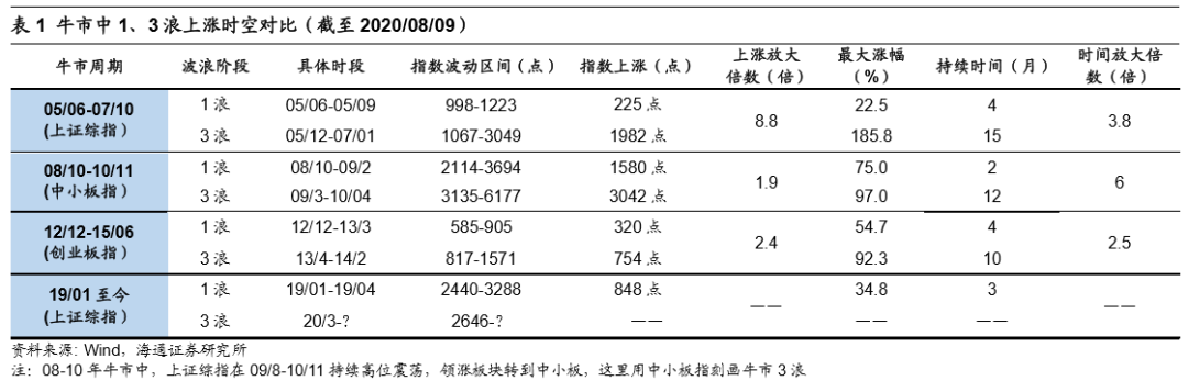 中期牛市3浪继续,短期调整属于扰动。我们之前一直强调,上证综指19年2440点=05年998点,2440点是A股第六轮牛市的起点,这轮跨度几年的牛市有三个逻辑:牛熊周期轮回、企业盈利见底回升、大类资产偏向股市。这次牛市3浪上涨趋势未变,源于资金面+基本面双轮驱动股市上涨。目前宏观流动性偏松格局未变,资金面看宏观和微观两个方面,宏观流动性指标包括:十年期国债收益率、R007利率、加权平均贷款利率、LPR利率、银行理财利率、非证券投资类信托产品利率,年初以来利率整体下行,5月份后十年期国债收益率和R007利率有所回升,但是其他4个利率指标整体仍是在低位。微观资金持续入市,在仅考虑高频可跟踪的散户、公募、杠杆资金、外资、险资以及IPO、产业资本的口径下,今年上半年股市资金净流入已经超过6200亿,预计全年资金净流入超1.5万亿,详见《有多少水可以进来?——再论资金入市-20200805》。我国基本面回升源于两大动力:一是经济周期因素,二是政策推进,工业企业利润总额当月同比增速从3月的-34.9%最低点回升到6月的11.5%,回升态势非常明显,我们预计基本面数据下半年回升,Q2/Q3/Q4三个季度单季净利润同比增速分别为-3%、13%、20%,全年A股净利同比有望达到0-5%。我们在《牛市3浪的三大特征-20200712》中做过牛市3浪在时空两个维度上与1浪的对比,结论是3浪上涨的时间往往持续10-15个月,最大涨幅大致在70%-180%之间。相对于牛市1浪,3浪上涨时间大约是1浪的3-5倍,3浪的长度(指数上涨的绝对值)约是1浪的2-11倍。最近两天市场出现调整,这次调整只是事件性因素扰动所致,近期美方对中国社交软件tiktok、微信等采取限制性措施,中美关系再度趋于紧张,从而影响市场风险偏好。参考历史上牛市3浪中的小调整,时间和空间都不大。驱动牛市3浪上涨的两大因素未变,即资金面宽松和基本面改善趋势未变,所以牛市3浪中期趋势不变,真正需要担心的风险是随着经济逐步复苏,通胀压力抬升导致货币政策转向,届时市场恐将迎来3浪上涨后的4浪回调。