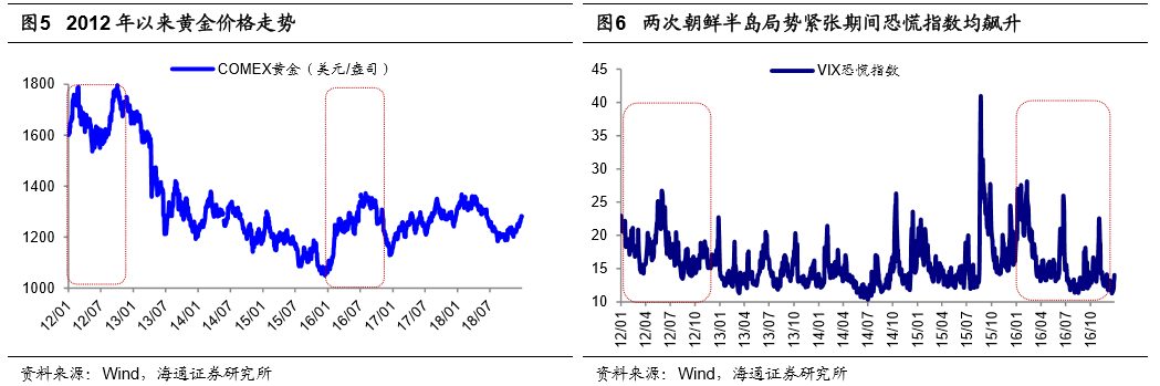 第三,避险属性。在国际上出现政治、军事和经济问题时,投资者倾向于快速降低风险偏好配置黄金,导致金价快速上涨。典型代表时期包括2012年和2016年朝鲜半岛矛盾加剧。2012年COMEX黄金价格累计上涨了5%,年内最大涨幅达到16%,当时金价上涨的背景是韩国总统大选落幕,执政党候选人朴槿惠以微弱优势胜出,朝鲜更换国家领导人,此后两度发射卫星,朝鲜半岛局势再度趋紧,VIX恐慌指数快速攀升,年内最大涨幅达87%。2016年COMEX黄金价格累计上涨了7%,年内最大涨幅达到28%,当时金价上涨的背景是朝鲜分别在1月6日和9月9日进行了第四次和第五次核试验,表明朝鲜已具备一定核武器制造能力,这引发韩国和国际社会强烈反应,为此韩国政府于16年2月10日起关闭开城工业园,安理会也通过了第2270号和第2321号涉朝制裁决议,美国也加大了在朝鲜半岛的军事部署,朝鲜半岛局势再度紧张,VIX恐慌指数两度快速攀升,年内最大涨幅达99%。