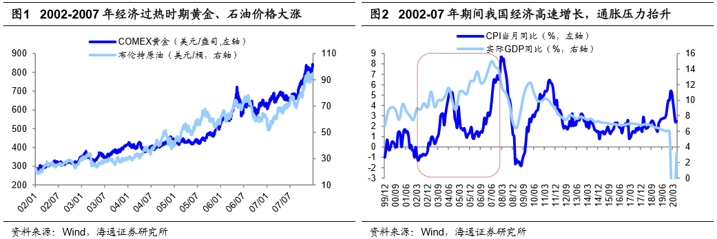 第一,商品属性。黄金的商品属性主要体现在黄金首饰和工业用金方面,此时黄金价格走势主要与经济宏观形势有关,当宏观经济持续向好,经济步入过热阶段,物价上涨导致通胀压力抬升,黄金价格将随之上涨,反之亦然。典型代表时期就是2002-2007年期间,当时COMEX黄金价格最大涨幅为203%,布伦特原油为420%,LME铜为496%,LME铝为146%。这时黄金价格大涨的背景是当时中国刚加入WTO,积极融入全球制造分工体系,我国成为全球工厂,经济保持高速增长,GDP增速平均保持在11.2%,经济出现过热迹象,物价快速上涨进入通胀阶段,各类商品价格大幅上涨,黄金也不例外。