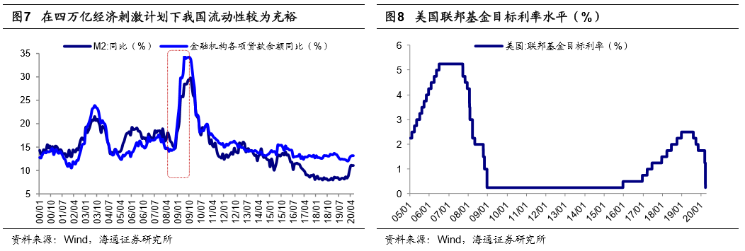 今年3月下旬以来A股黄金齐涨类似08年底-09年初。这次自3月下旬以来上证指数累计涨幅/最大涨幅22.9%/30.7%,创业板指为45.7%/59.4%,标普500为39.7%/53.0%,德国DAX指数为50.1%/61.3%,富时100为18.7%/34.5%,COMEX黄金为37.2%/40.0%,金价创历史新高,金价上涨主要体现其货币属性。这次黄金股市齐上涨背景类似08年底-09年初,均是为应对困境而采取宽松政策,充裕流动性叠加美元贬值驱动黄金价格上涨,金价上涨更体现其货币属性。08年美国次贷危机升级为全球金融危机,为应对金融系统流动性压力,美联储降低基准利率至0附近,并通过量化宽松政策直接向市场注入流动性,美元指数也开始下跌,在宽松流动性和美元贬值背景下黄金价格开始上涨。当时我国经济也受到全球金融危机波及,为此我国在08年11月推出了“四万亿”经济刺激计划,在流动性充裕背景下,A股开始启动反弹。总体而言,我国由于受到全球危机冲击小,且采取有力的刺激政策,经济迅速企稳,A股也早早见底回升,相对而言美国由于身处金融危机中心,加之金融对冲政策受到道德风险等钳制,经济刺激政策推进缓慢,美股直到09年3月才开始企稳。在全球新冠肺炎疫情蔓延下,经济活动陷入停滞状态,市场流动性压力显现。这次美国吸取了08年金融危机的教训,在疫情初期就推出了大量政策工具对冲风险,这些措施短期有效缓解了市场流动性压力,美元指数也快速贬值,从20年3月19日高点102.7点降至20年8月6日低点92.8点,最大降幅达到9.6%,在此背景下黄金价格也开始水涨船高。在2月初国内疫情爆发后,我国积极采取管控措施防范疫情蔓延,同时为应对疫情冲击,央行提供流动性并加息,加大减税降费力度,专项债扩大发行规模。目前国内流动性维持宽松格局,最新中共中央政治局会议显示目前担忧货币政策收紧为时尚早,股市微观资金继续入市,我们预计全年资金净流入超1.5万亿。短期来看当前美国已经推动足够多的政策来缓解流动性风险,但长远而言真正规避金融危机还需控制住疫情。对比而言,我国在疫情控制方面显然做得比美国更好,相应地这次我国股市表现也更稳健。