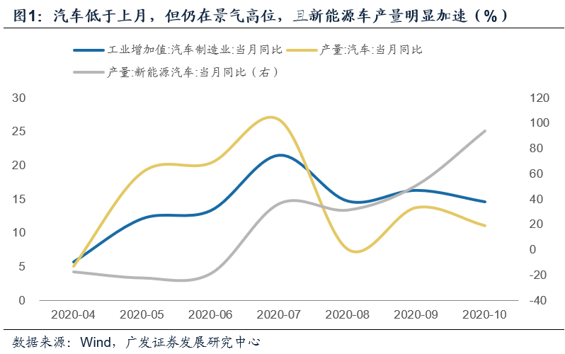 汽车增加值同比增速10月为14.7%,低于上月的16.4%,但依然算是在景气高位。产量增速为11.1%,低于上月的13.8%;但新能源车产量同比达94.1%,较上月(51.1%)大幅加速。