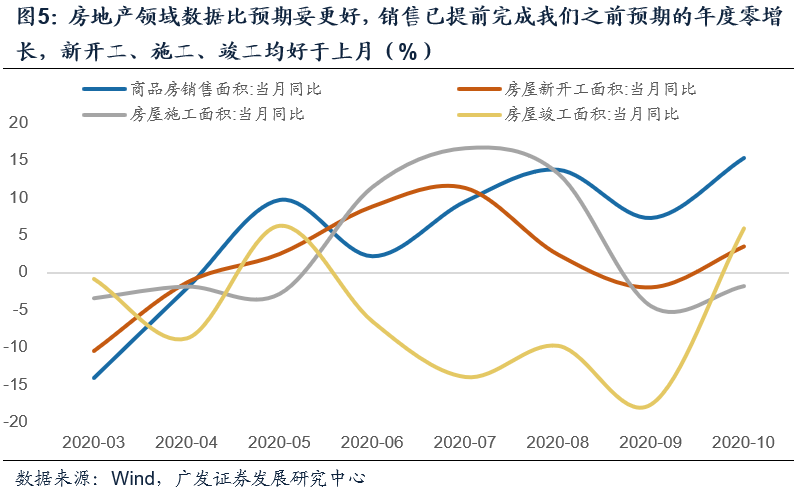 从实际出来的数据看,地产领域的数据比预期还要好。销售单月增速超过15%,至10月累计同比零增长。在前期我们指出“今年全年增速继续朝零增长靠近”、“2018年以来基本上每年增速都在零增长附近”。目前来看,今年地产销售比这一坐标要更强。