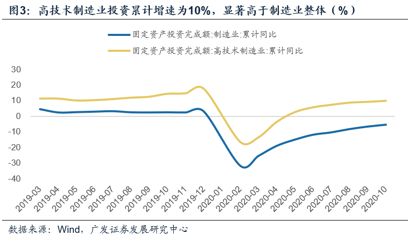 高技术制造业投资截止10月累计增速为10%,进一步高于上月的9.3%。