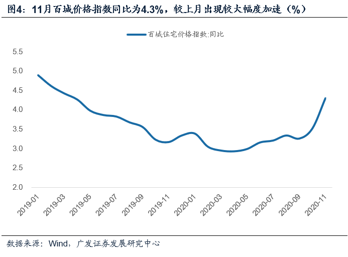 百城住宅价格指数11月同比为4.3%,较上月加快0.8个点,是本轮以来幅度最大的一个月。这一点还是值得关注的。