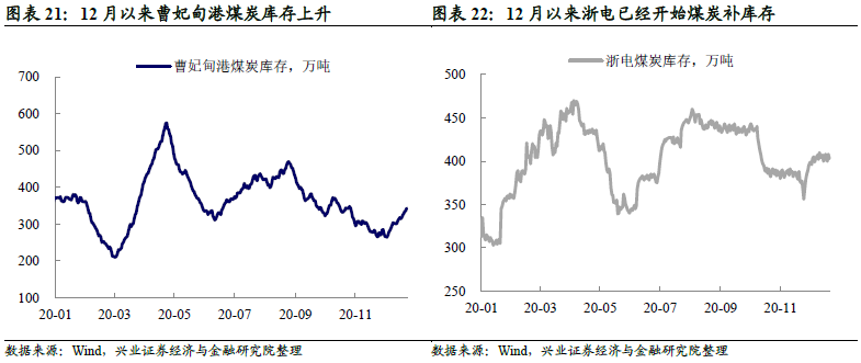 从供给端看,高频港口和电厂库存数据已经出现回升。(1)12月以来北方曹妃甸港口煤炭库存结束持续3个月下行趋势,开始出现上升。(2)12月以来,浙电也结束了持续4个月的煤炭库存去化,煤炭库也开始上升。港口库存、电厂库存同步掉头向上,或反映电力缓解煤炭供给压力正在逐渐缓解。