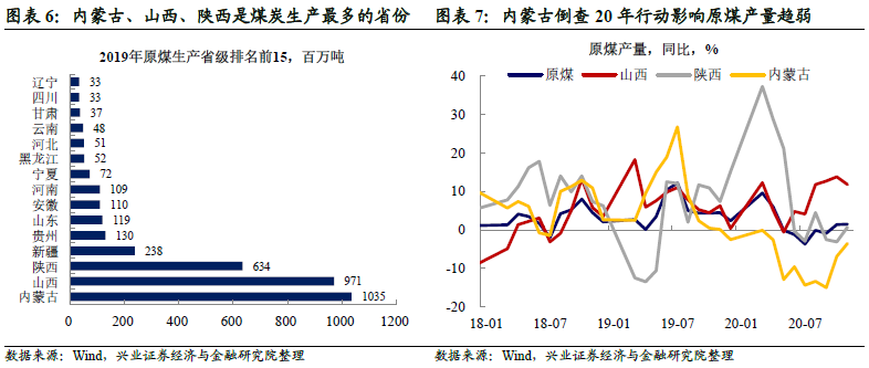 内蒙古“倒查20年”涉煤反腐行动影响下半年煤炭产量趋弱。前几年煤炭行业的供给侧改革,稳定了煤炭价格,同时内蒙古、山西、陕西成为煤炭生产最多的省份(2019年数据)。但是,今年内蒙古进行了“倒查20年”涉煤反腐行动,影响了内蒙古的煤炭产量,使得今年5月以来全国煤炭产量增速偏低。另外,年底还有煤矿由于安全因素停工的情况,也是扰动煤炭供给的额外因素。