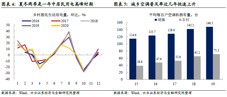 天气降温加剧季节性需求+空调普及,生活用电需求增加。2019年居民生活用电占全社会用电量14.2%。从季节性规律来看,冬季南方电力取暖需求会明显上升,最近两年12月的生活用电环比均在10%左右,显著高于之前4年的平均水平6.5%。加之今年12月东部地区较往年降温明显,短期内加大了居民生活用电需求增长。同时,近几年空调普及率快速上升,2019年相对2015年,城镇每百户拥有量从114.6台增长到148.2台,增长了29.4%;农村从38.8台增长到71.3台,增长了83.8%;空调普及率上升可能也是导致12月气温下降之际,居民用电需求较往年明显增加的重要原因。