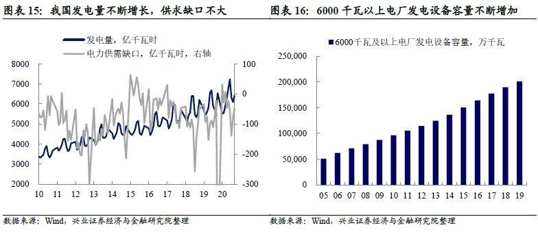 电力层面,近年来供给稳定增长,发电容量不断增加。从电力供给层面看,虽然2016-2017年供给侧改革大力度压缩过剩产能,但我国发电量整体保持上升趋势,6000千瓦以上电厂发电设备容量不断增加,电力供给并未受供给侧改革影响而下降。从电力供需缺口层面看,2016-2017年供给侧改革推进过程中,我国电力供需缺口虽然扩大,但一方面即使缺口最大时期缺口程度也未超过2%,另一方面2019年以来电力供求缺口逐渐修复。