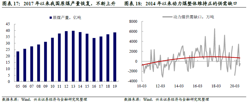 煤炭层面,供给虽受压缩,但供需缺口整体为正缺口。2013-2015年,受经济下行影响,我国原煤产量连续下降。2016年供给侧改革重点发力煤炭产能去化,原煤产量下行趋势较前期加剧。但是从2017年开始,我国原煤产量开始恢复,此后逐年增长。从与发电更相关的动力煤供求缺口看,经历过2016-2017年供给侧改革后,动力煤整体维持供需正缺口,我国不存在趋势性的动力煤供不应求问题。