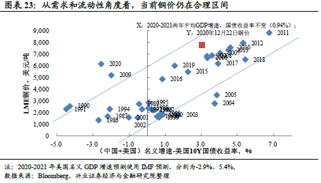 当前全球大宗价格已“price in”2021年复苏预期。我们在2021年海外年报《雨歇青山近,远望道阻长》中指出,当前全球金融市场对2021年上半年经济复苏已有相当程度的反映,尤其是在拜登胜选以及疫苗出现进展之后,通胀预期开始快速上升。以大宗商品为例,如果综合考虑需求及流动性(以中美名义GDP增速代表需求端,美债收益率代表流动性预期),历史经验来看,铜价与之保持一定正相关。如果以2020年经济增速来看,当前铜价已较高。但如果综合考虑2020~2021年经济增速,并假设明年流动性环境不会发生较大变化,当前铜价仍在合理区间,即当前的大宗商品价格对2021年的经济恢复预期已经较高。