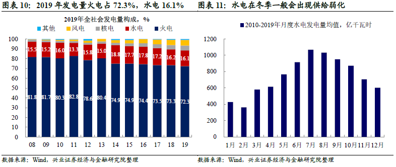 过高的煤价可能也影响了发电增长。我国电力供给主要来自火电和水电,2019年火电占比高达72.3%,水电占比16.1%。近年来,虽然煤电联动机制不断完善,但上网电价还没有完全市场化,因而煤价偏高,会给电厂带来盈利压力,影响火电供给。同时,冬季一般是河流枯水期,水电在往年冬季一般也会出现供给弱化。