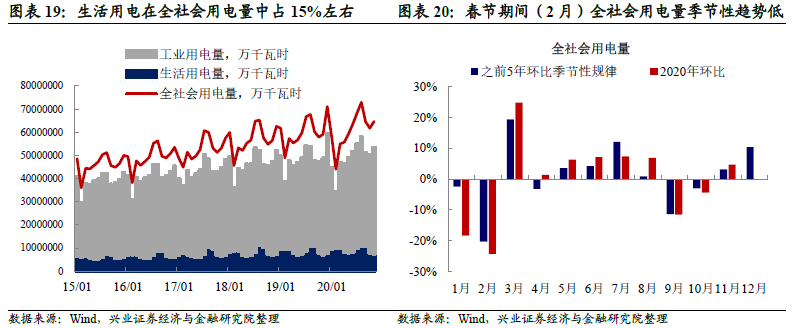 从需求端看,春节将至、赶工落幕,工业用电需求将缓解。(1)工业用电方面,随着春节即将来临,经历赶工高峰期后,工厂赶工也即将落幕,后续生产将回归正轨,工业用电需求2月或将经历下滑,春节后恢复稳定。(2)生活用电方面,根据季节性规律,春节前后或面临生活用电高峰,但生活用电在全社会用电量中整体只占15%左右,春节期间生活用电需求增加或许不足以抵消工厂放假导致的工业用电下滑。