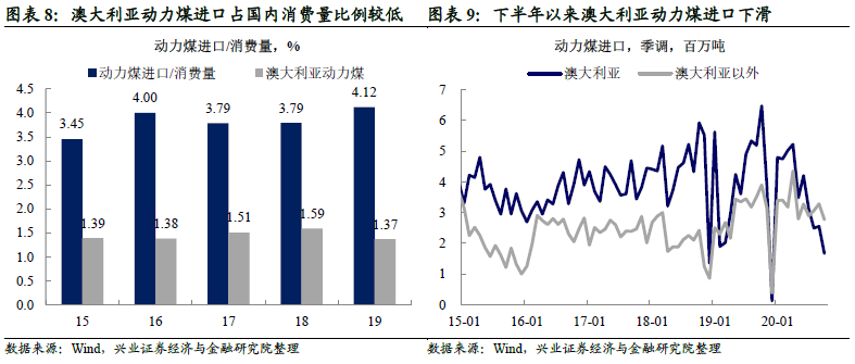 澳煤进口下滑,但整体占比较低,有边际影响但不是重要因素。今年下半年动力煤进口有所下滑,其中澳大利亚动力煤进口下滑比较明显,其他国家(或地区)动力煤进口变化相对不大。但煤炭进口占国内煤炭消费量比例并不高,2019年,动力煤进口占国内消费量比例4.12%,澳大利亚动力煤占比仅为1.37%。由此来看,虽然澳大利亚动力煤进口下滑,但对国内动力煤供需的影响较小,不是影响煤炭供给的重要因素。