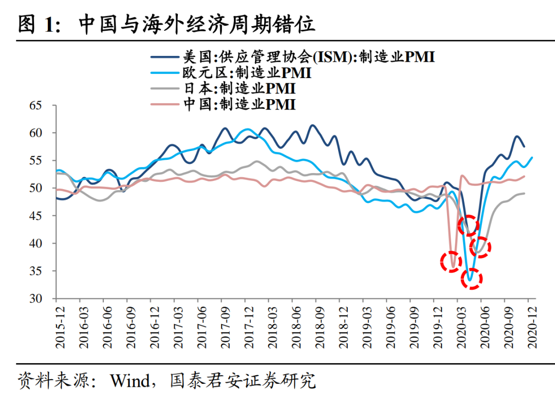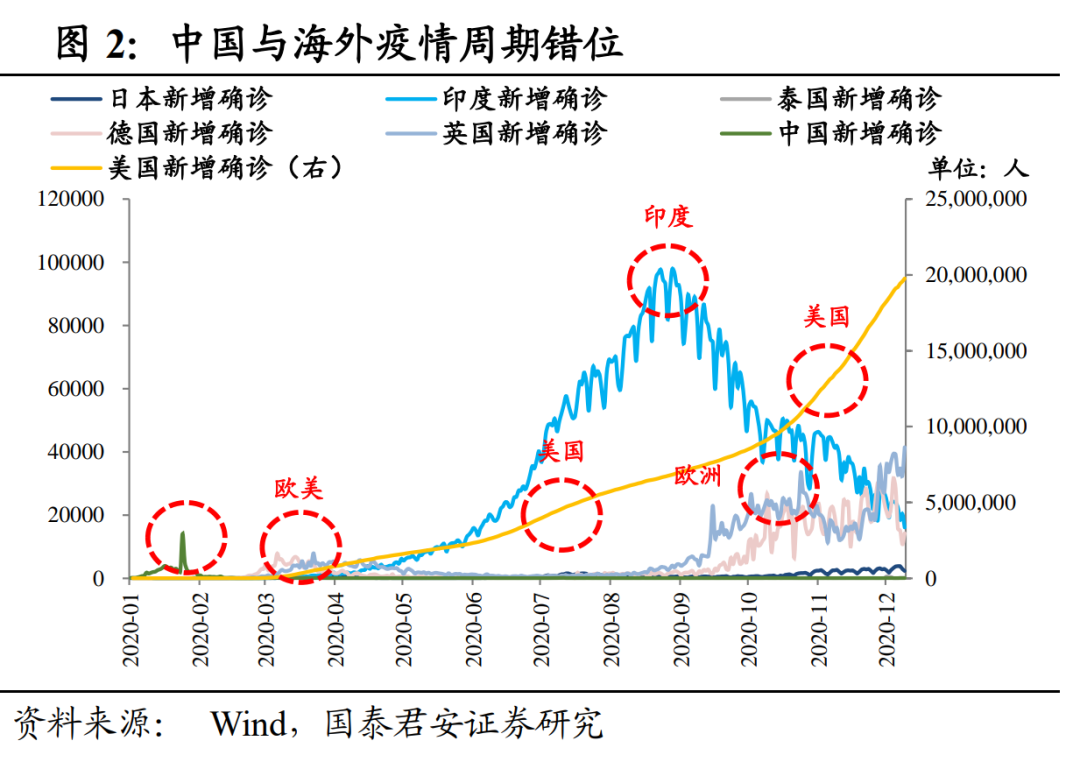 ①疫情周期错位:中国1月底疫情爆发,2月中旬后每日新增确诊人数便开始大幅下降,3-4月疫情逐步得到控制,在全球率先开始复产复工;3月欧美疫情大规模爆发,4月新兴市场疫情爆发,全球确诊人数不断攀升,6-7月美国、欧洲疫情二次爆发,11-12月海外陆续三次爆发、出现病毒变异。