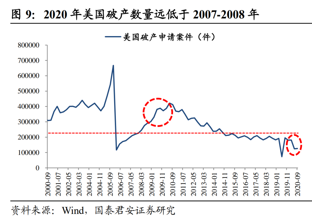 以美国为例,疫情期间企业破产数量并未像金融危机期间一样激增。美国2020年疫情期间财政支持力度大,前三季度破产申请案件43万件,甚至低于往年均值,而2007-2008年金融危机期间破产申请分别达到85万件和112万件。说明目前美国企业大多处于短暂休眠状态而非破产清算,一旦疫情得到控制,休眠的美国企业供给端弹性高,产能将迅速修复。