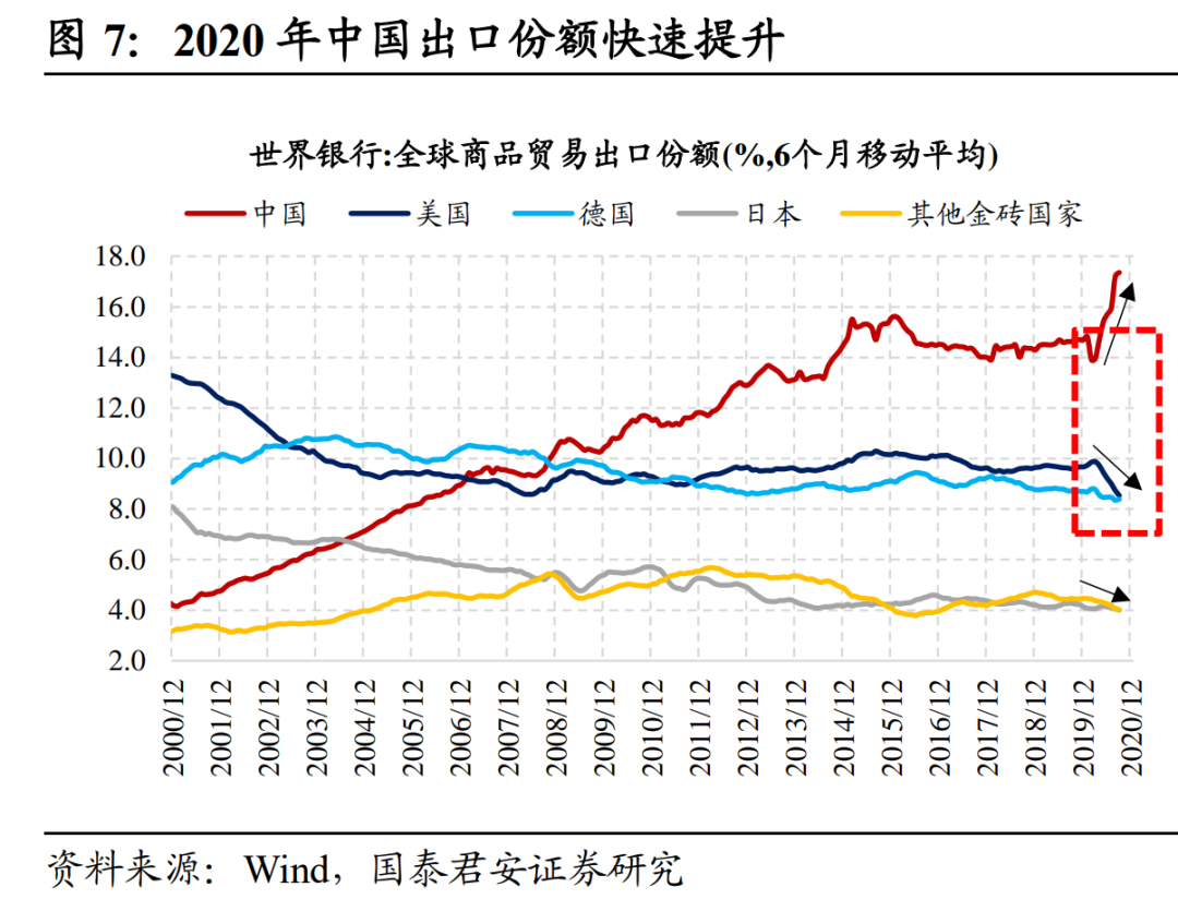 三重错位导致2020年人民币大幅升值和中国出口份额大幅提升。一方面,人民币兑美元中间价从5月的7.2持续升值至12月的6.5。另一方面,中国出口份额由2019年底的14.7%上升至2020年9月底的17.4%。