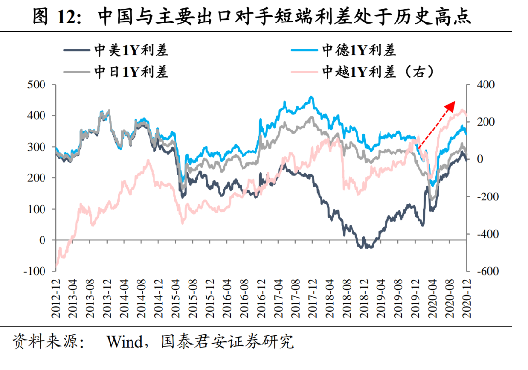 短端利差来看,12月底中美、中德、中日、中越1年期国债利差分别为232BP、340BP、274BP、255BP,均处于历史高点。