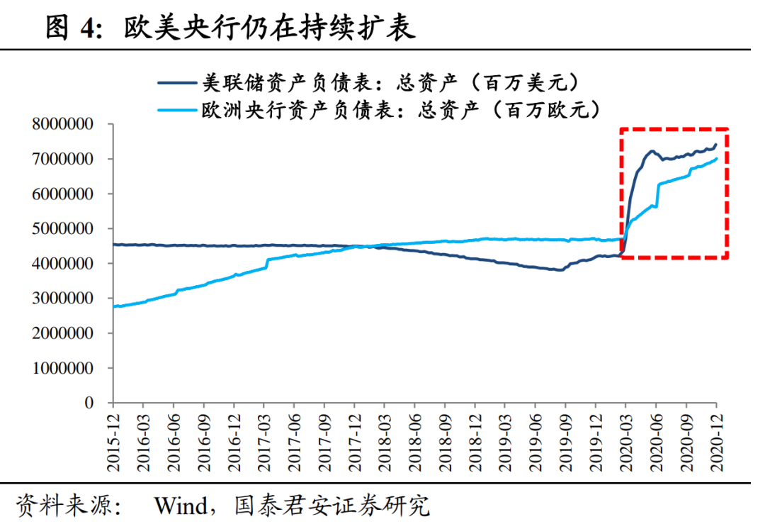 外部宽松确定性高,国内货币政策无持续收紧必要。对比欧美政策,拜登主张扩大财政刺激,推进疫情救济计划,需要美联储维持宽松赤字货币化以支持;欧洲病毒变异+经济复苏,仍需财政政策支持,12月欧央行增加PEPP计划扩大购买力度。反观国内,2021年内部维稳+外部不确定性高,海内外货币政策差已经较大,中国货币政策没有持续收紧的必要。