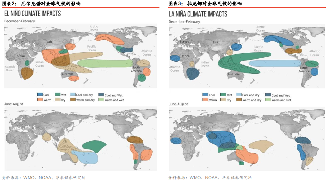拉尼娜发生年的12月至次年2月期间,通常导致澳洲东部、东南亚、巴西东北部、南美其他北部地区和非洲南部降水增加;乌拉圭和阿根廷部分地区以及非洲南部降水不足,厄瓜多尔沿海和秘鲁西北部地区通常比正常年份更为干燥;次年6月至8月期间,常导致巴西南部和阿根廷北部降水减少,澳洲南部和东南亚降水增多。在我国,拉尼娜现象常常伴随着“冬冷夏热、南旱北涝”的气候特征,沙尘暴及台风发生概率加大。