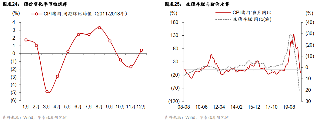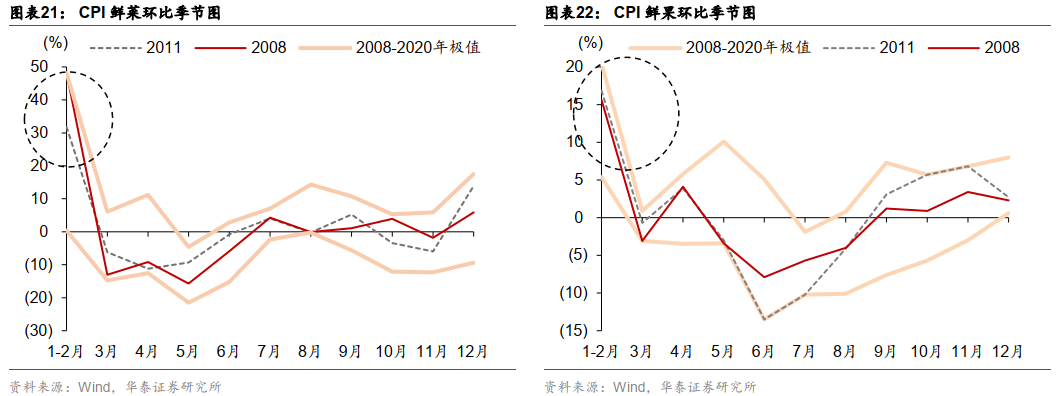 鲜菜:冬季雨雪低温影响蔬菜的生长、采摘运输等环节,菜价有季节性上行规律,而冷冬可能加剧菜价上涨幅度与持续性。蔬菜生长方面,持续低温和缺乏光照会导致蔬菜叶片卷曲、生长缓慢、幼果脱落和果实畸形、抗病虫性减弱,强寒潮与大雪还可能造成大棚倒塌而蔬菜绝收。采摘运输方面,冬季更依赖“南菜北运”,而雨雪道路结冰,鲜菜调运的难度提高、成本上升。因此冬季蔬菜有季节性涨价规律,而冷冬可能加重上述影响程度。我们计算自2008年以来1-2月鲜菜CPI累计涨幅超过30%的有:2008年48.2%、2011年31.8%、2016年39.3%,可以佐证冷冬时期确实显著加大了菜价上涨压力。
