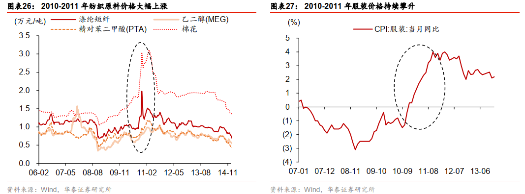 纺服:冷冬带动御寒需求,关注纺织服装产业链涨价压力。如前述,冷冬会提振物理取暖用品需求,并对上游棉花、化纤等原料形成拉动,2010-2011年曾发生过上下游螺旋涨价现象。当时宏观背景是全球流动性过剩,期货投机炒作氛围较浓,叠加棉花连续三年减产、冷冬环境与国际油价上涨等因素驱动,2010年底棉花、PTA、MEG、涤纶等纺织原料价格大幅上涨。服装价格在需求拉动叠加成本推动下快速涨价,CPI服装同比自2010年9月低点-1.5%骤然攀升至2011年11月高点4%。本次冷冬逐步发酵,羽绒价格自去年8月以来已积累不小涨幅,冷冬叠加春节较晚,关注纺织服装产业链景气度回升与涨价压力。