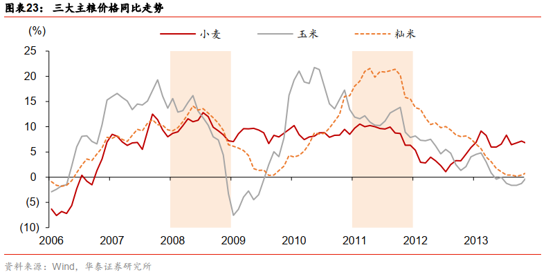 粮食:冷冬导致国内粮食减产概率较低,对粮价影响较小。我国越冬粮食作物以冬小麦为主,而玉米和稻谷一般于3-4月播种,其产量与冷冬相关性低。冬小麦具有耐寒性强的特点, 气温处于-26℃以上即可安全越冬。冬小麦的种植区域分布在长城以南的华北部分地区和长江流域,2008年与2011年初这些地区气温均未达到受冻临界值。如前文所述,冷冬反而可能对冬小麦增产形成利好,2008与2011年的小麦产量同比分别增产10616、3392万吨,此前两次冷冬当年三大主粮价格基本稳定。