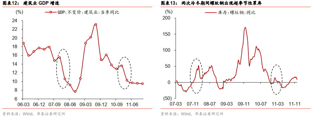 冷冬的户外环境更为恶劣,对建筑业生产负面影响也更显著。微观层面,螺纹钢是建筑活动重要投入材料,两次冷冬时期螺纹钢均出现超季节性累库,阶段性偏离于原先运行轨道。宏观层面,2008年一季度与2011年一季度的建筑业GDP增速环比分别下滑4.9个百分点、3.3个百分点,自2008年以来仅有2009年四季度(金融危机)与2020年一季度(新冠危机)环比跌幅超过这两个季度。