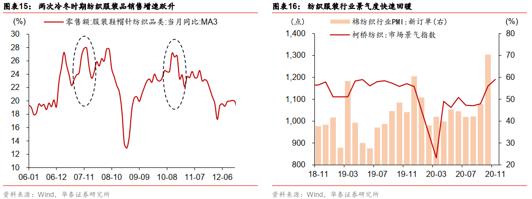纺织服装:因天冷、节多,冬季是服装、家纺销售的传统旺季,冷冬起到助推作用,此前两次冷冬时期纺织服装品销售额增速均出现过跃升。去年底冷冬逐步发酵,10月棉纺织行业PMI新订单跳升至70.4%,创2013年数据统计以来新高,柯桥纺织市场景气指数也快速走高,冷冬刺激之下纺织服装行业景气度在快速回暖。国家气象局预计今年1月全国冷空气活动较强、仍处在降温过程,且今年春节较晚,纺织服装销售旺季或将有所延长。